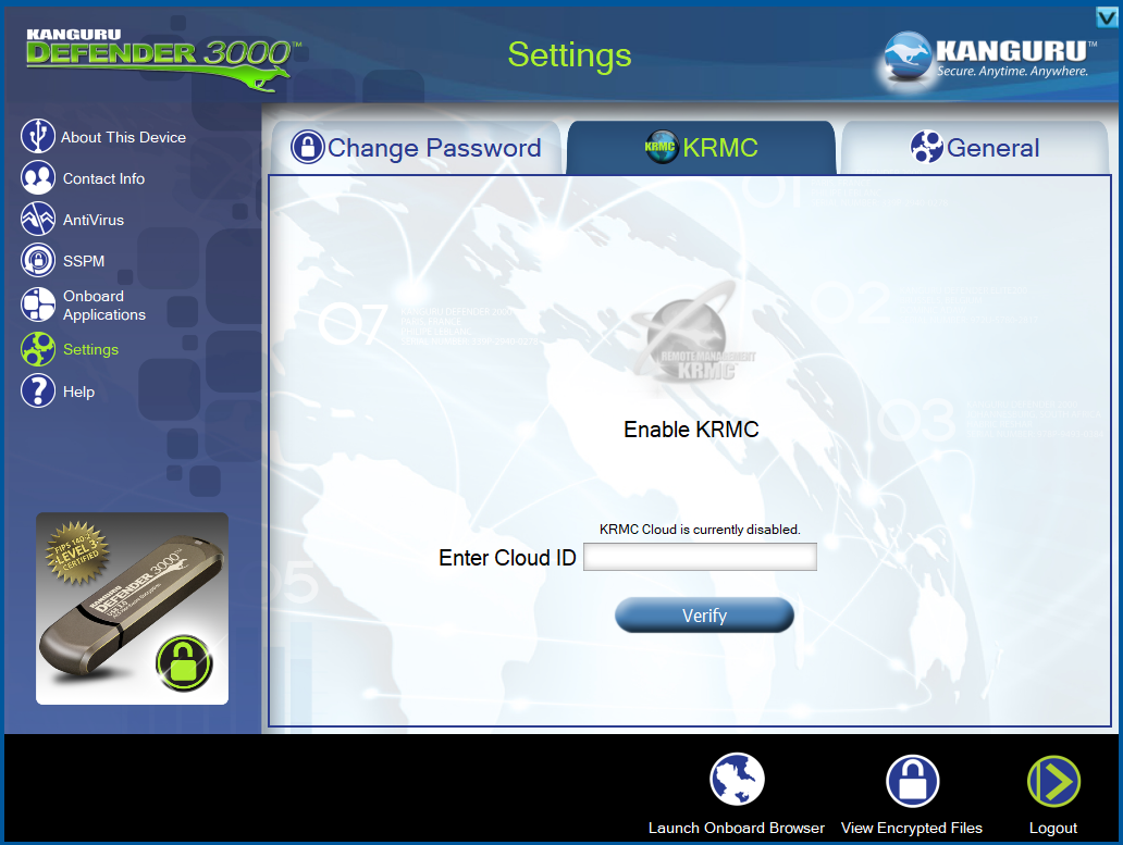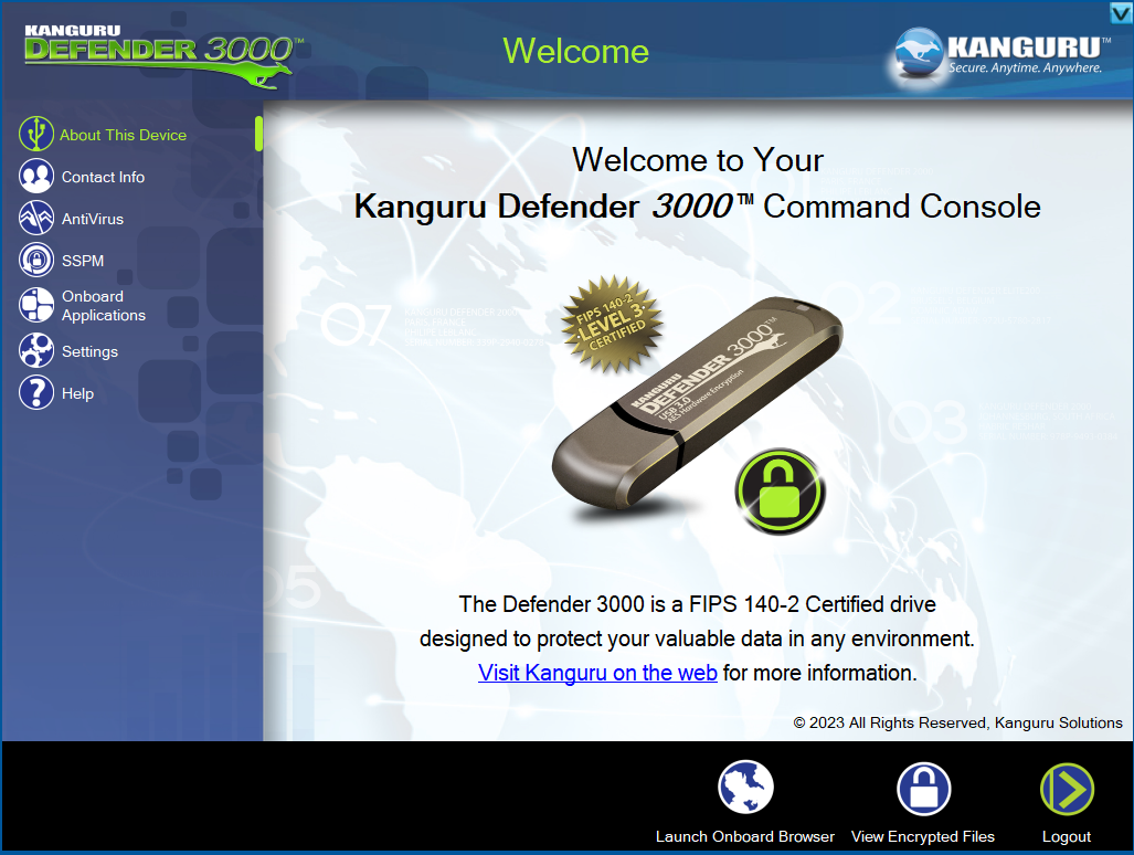 All Defender® hardware encrypted drives will soon feature Kanguru's new, built-in Kanguru Command Console†, a free, intuitive, user-friendly interface that allows you to quickly view all of the settings, preferences and onboard applications of your Defender secure drive.