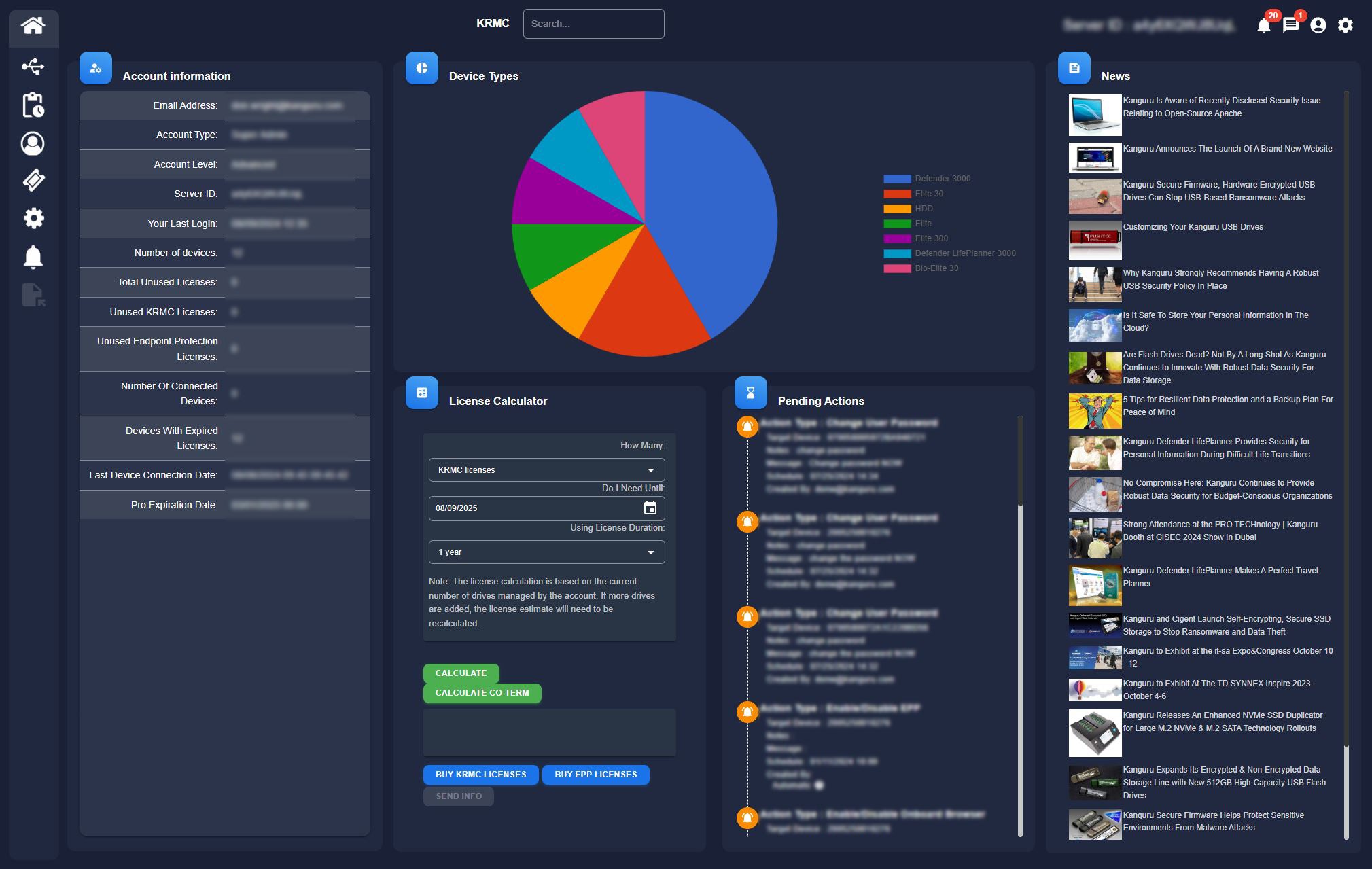 The Kanguru Remote Management Console (KRMC) is the world's most powerful, fully-integrated remote management platform for managing and monitoring the security attributes of Kanguru Defender encrypted drives. In August 2024 Kanguru rebranded KRMC to KRMC-Hosted, with an enhanced, contemporary interface, new pricing structure and convenient added features.