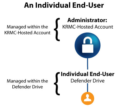 When an individual purchases a Kanguru Defender secure drive for personal use, they assume both the roles of End-User and Administrator. The data on the Defender device remains secure and accessible only to the owner. As the drive's Administrator, the owner can also have full control and management capabilities through a separate KRMC-Hosted account. Should the owner choose to take advantage of the remote management account options available, they will have administrative management of the drive.